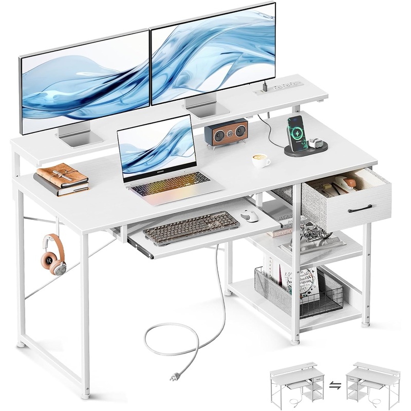 AODK Computer Desk with Keyboard Tray, 48 Inch Office Desk with Power Outlet, Work Desk with Drawer, Reversible Desk with Adjustable Monitor Shelf and Storage Shelf for Home, White