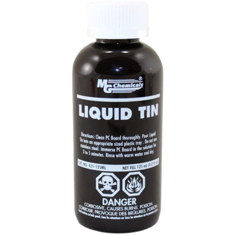 MG Chemicals Liquid Tin PCB Plating Solution 125mlEasy Tin Plating for DIY & Home ElectronicsMG Chemicals Liquid Tin makes it simple for everyday makers, hobbyists, and electronics enthusiasts to give homemade or custom printed circuit boards a professiona