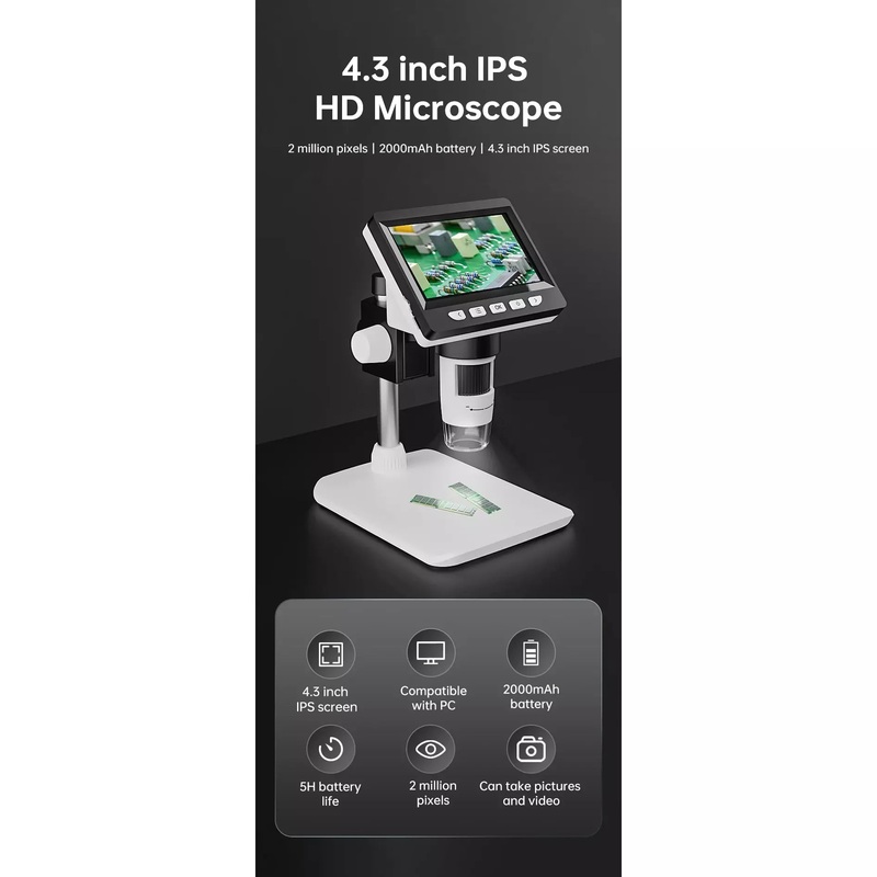 This LCD digital microscope features a bright 4.3-inch HD IPS display, offering real-time, high-definition images and videos. The 1080P high-resolution lens ensures you see every detail directly on the screenperfect for users who want effortless, large-screen viewing without straining their eyes or neck.