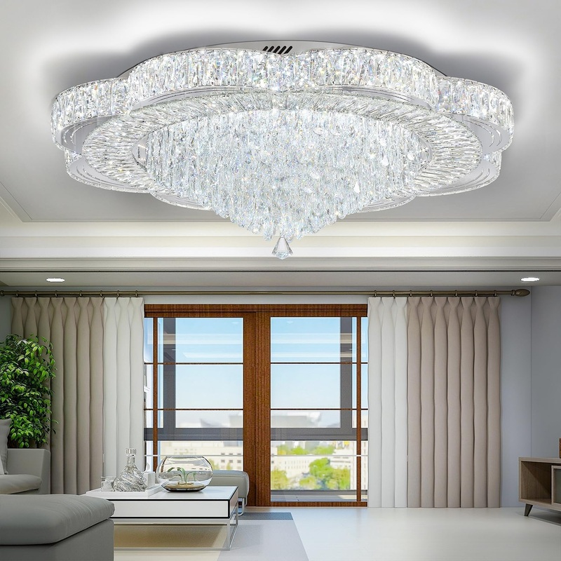 L1126Modern Empire Crystal Chandelier 40inches Chrome Crystal Raindrop Ceiling Light for Living Room Bedroom LED Infinity Dimmable 3000-6000KElegant Flush Mount Crystal Ceiling LightThis crystal raindrop ceiling light is equipped with polished stainless st