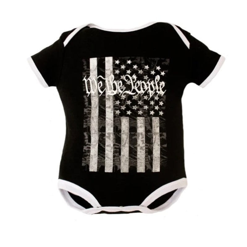 Style: 9001Features screen printed distressed We the People screen print and a bold American flag. 100% soft cotton bodysuit has a 3 snap bottom for easy diaper changes.