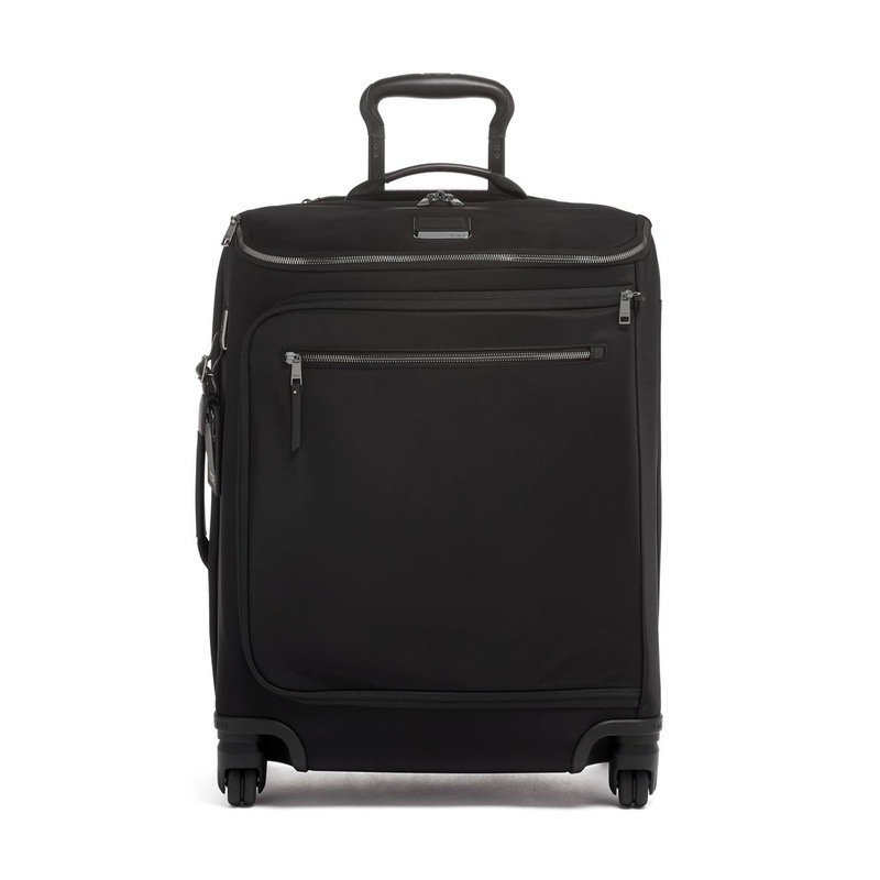 Front-lid or split-case zip entry to main compartment with locking zipper pulls, Built-in USB port, Front top-zip compartment (houses USB cable), Front straight-zip pocket, Front U-zip pocket accesses front lid compartment, 3-stage telescoping handle, 4 recessed wheels, Leather-wrapped top and side handles, Bottom grab handle, TUMI Tracer, Luggage tag